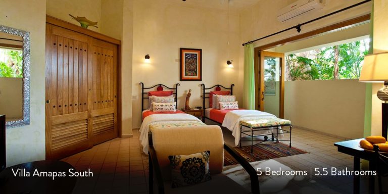 Villa Amapas South features a spacious master king bedroom suite with a private terrace and luxurious en-suite bath. There are two additional king guest suites, each with private en-suite baths. The fourth bedroom has a queen bed with two twin beds with a private en-suite bath, and is ideal for nannies or teens.