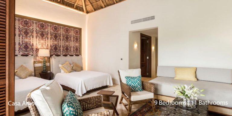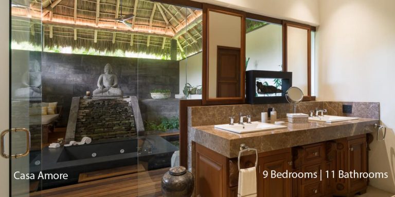 This world-class luxury Punta Mita vacation rental will accommodate up to twenty guests in twelve exquisite bedroom suites, each with private en-suite baths. Casa Amore features four master bedroom suites, each with a shower and tub, Satellite TV, DVD player, iPod Docking Station, Air Conditioning, and a Safe.  The Guest Villas on the property feature the remaining bedroom suites.