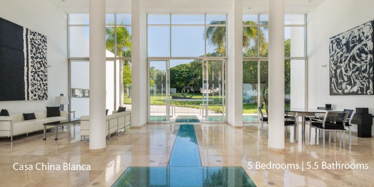 Enter Casa China Blanca over a clear glass walkway, reflecting pool into the grand living and dining room overlooking the infinity pool and terraces with walls of glass featuring breathtaking views.