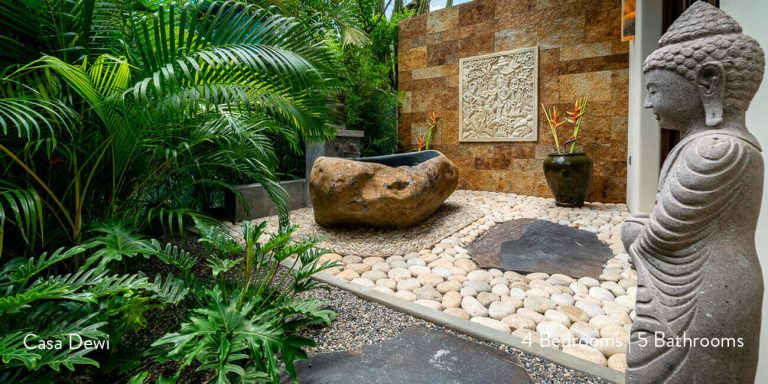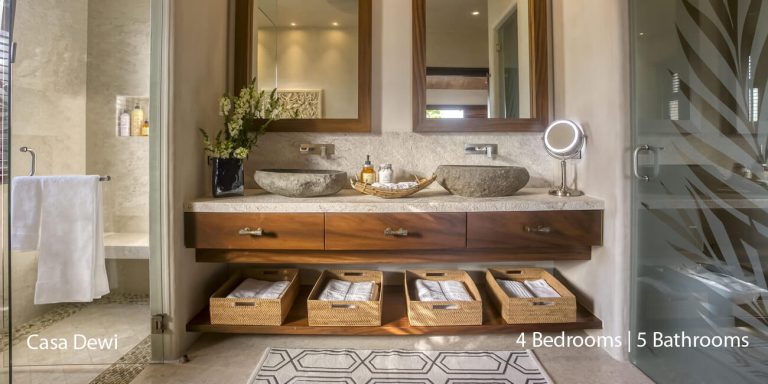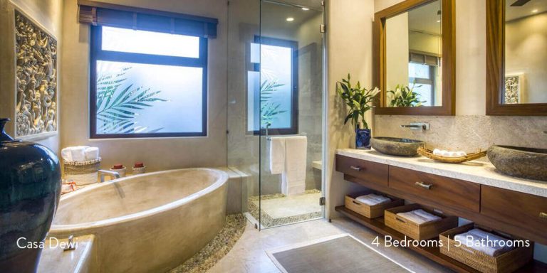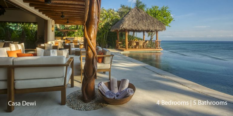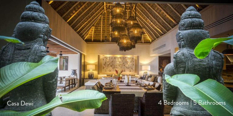 Casa Dewi offers four luxury bedroom suites, each with private en-suite baths. One of the king bedrooms opens to the pool terrace, while two of the guest bedrooms enjoy private balconies. The other guest bedroom opens to a private patio with an alfresco tub.