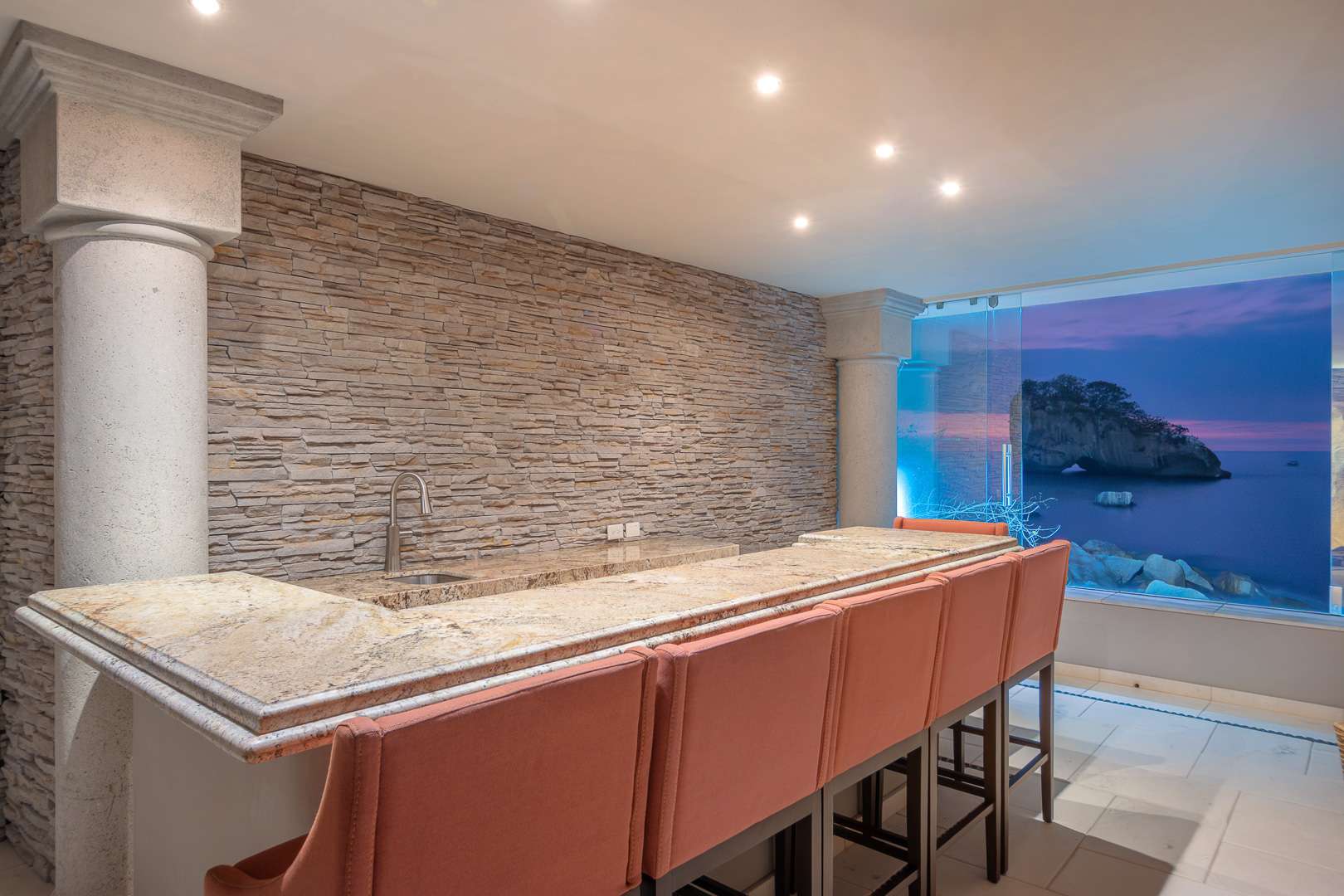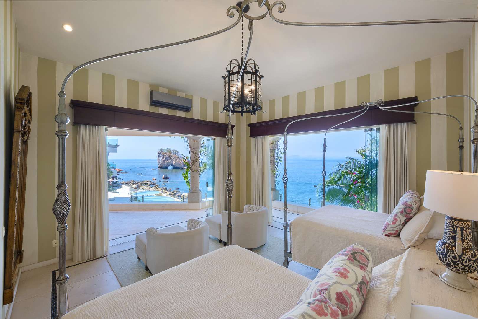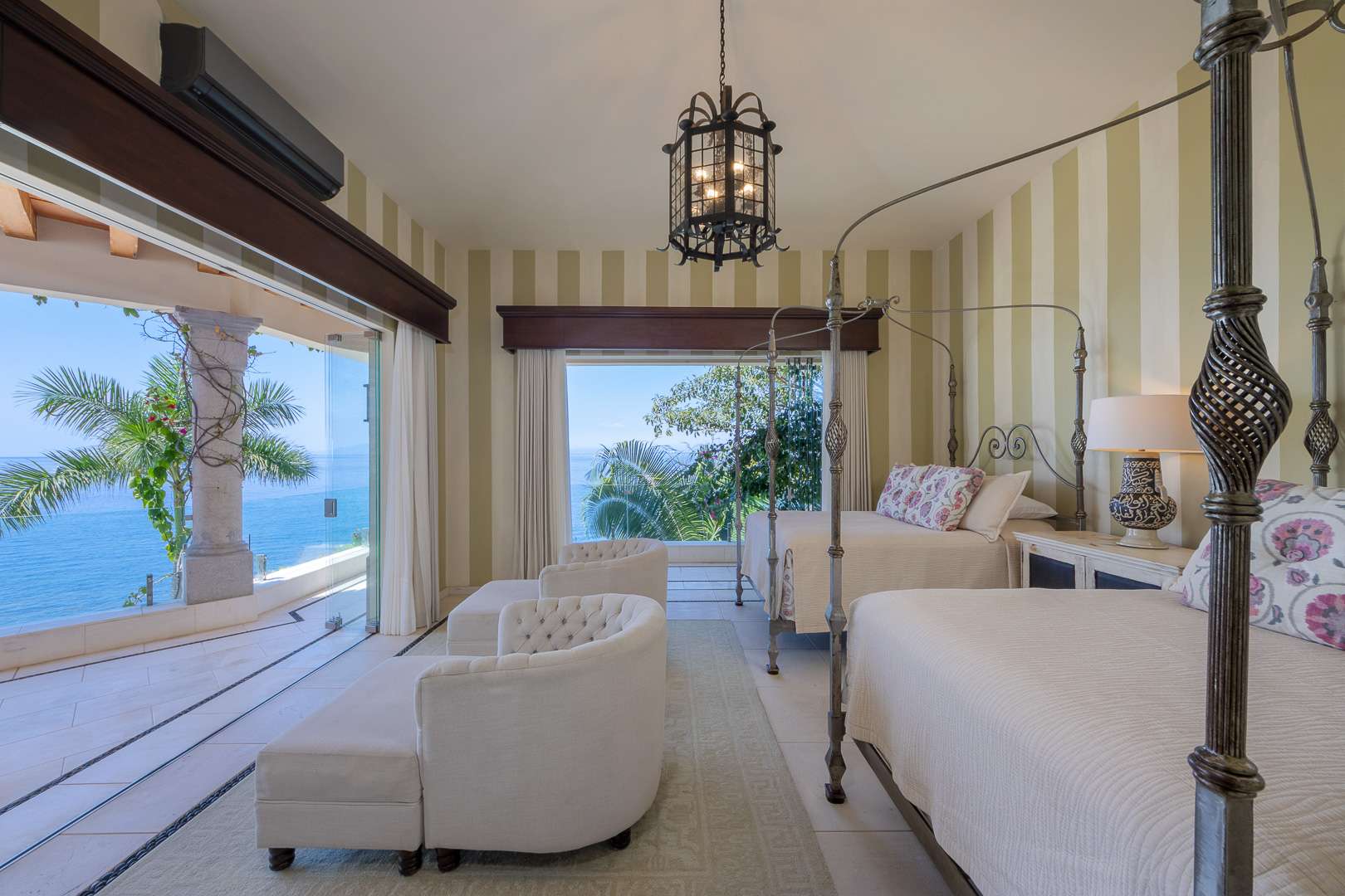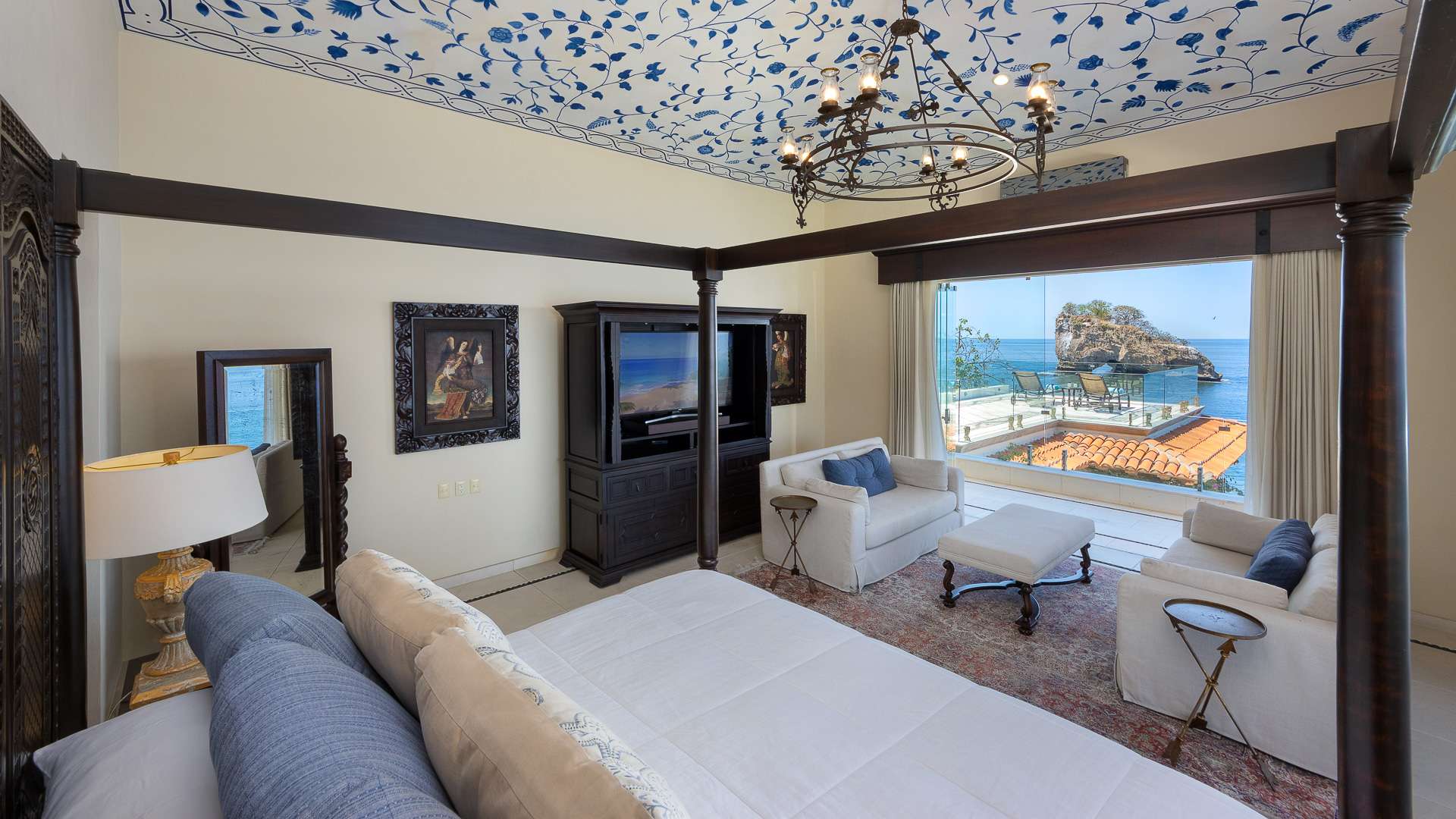 The villa’s architecture celebrates its breathtaking surroundings. Floor-to-ceiling openings blur the line between indoor and outdoor living, allowing natural light, ocean air, and panoramic views to define every space. Elegant living areas feature curated art, refined furnishings, and modern comforts.