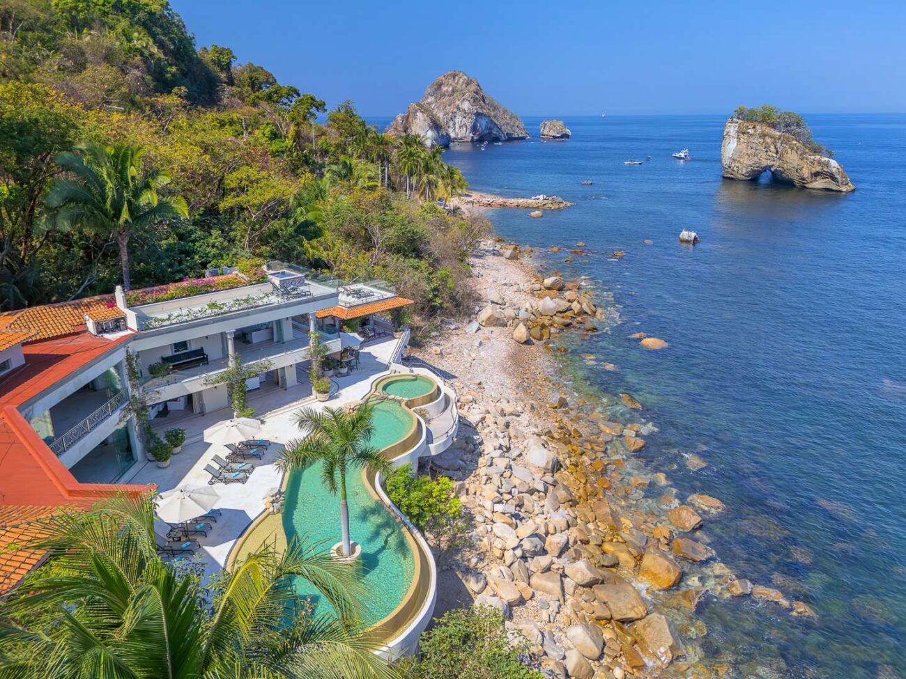 This luxury villa is majestically perched on the shoreline of Banderas Bay in the gated community of Sierra del Mar at Los Arcos. Casa Michael features an indoor-outdoor living space and the most breathtaking views. This Puerto Vallarta luxury villa rental offers you a vacation experience unparalleled by any other in Mexico. This exceptional vacation villa rental is the crown jewel of Puerto Vallarta and the ultimate getaway.
