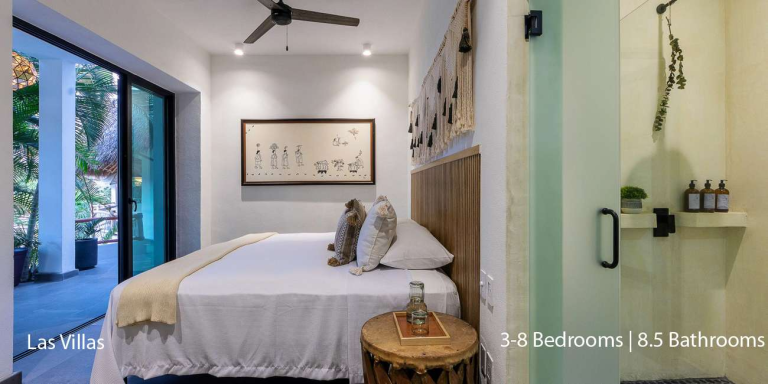 Las Villas boasts a modern Mexican design, incorporating natural materials like polished concrete, Mexican flagstone, stone inlays, and tropical hardwood. The neutral color palette allows the vibrant surroundings to take center stage, while contemporary interiors add a touch of understated elegance. Each corner of the villa is adorned with carefully curated pieces sourced from across Mexico and beyond, infusing every space with a sense of sophistication.