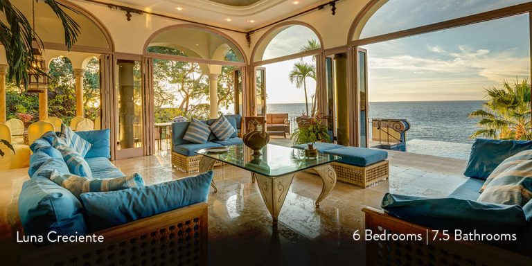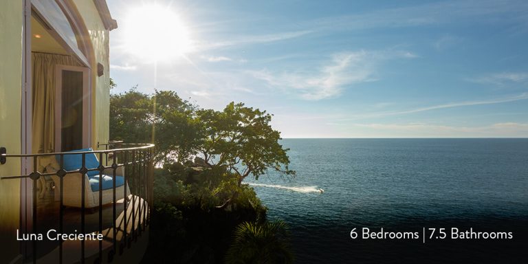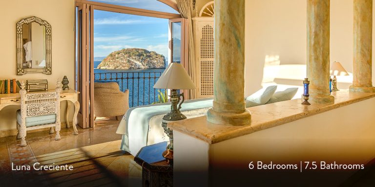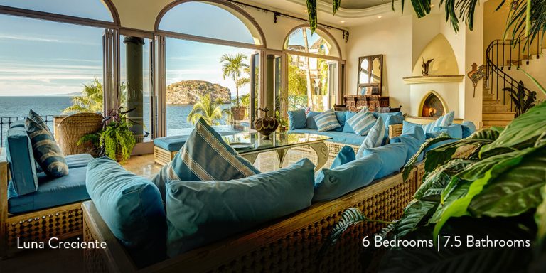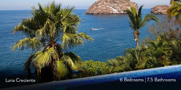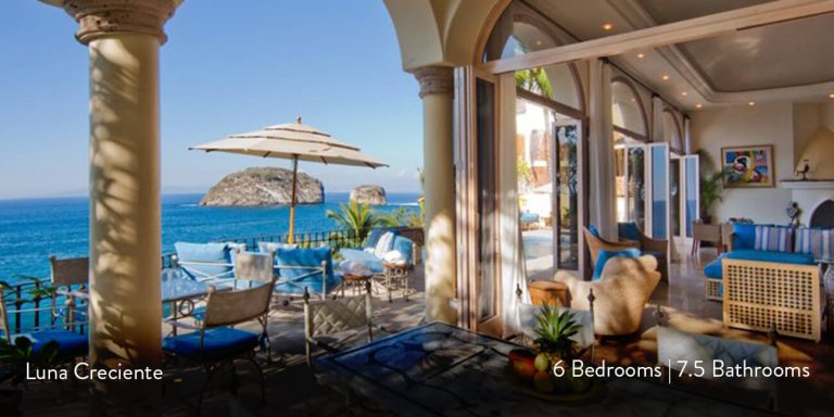 This Puerto Vallarta villa rental is Villa Luna Creciente, built into the shoreline overlooking Los Arcos Island and the Sierra Madre Mountains in the background.