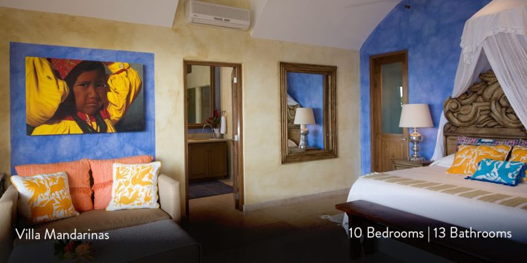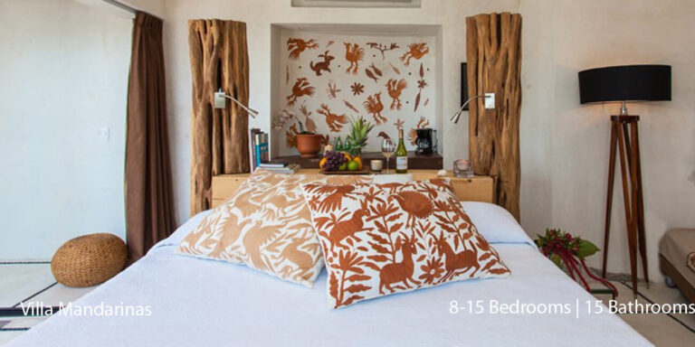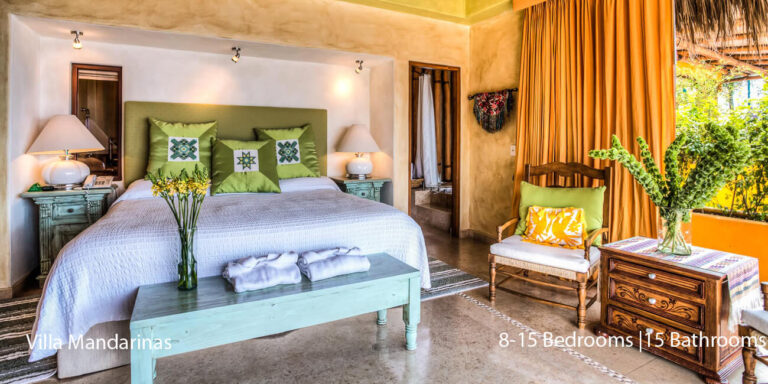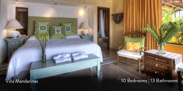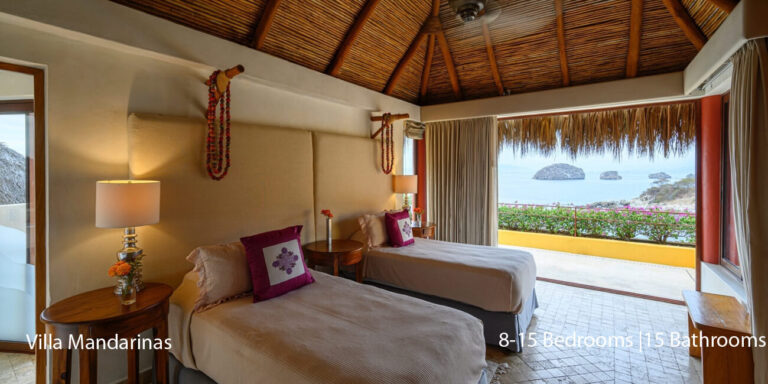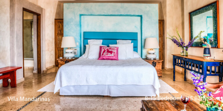 The villa features 16 bedrooms. Eight bedrooms are in the main villa, and eight bedrooms are in the south villa on the property. All bedrooms have ensuite bathrooms, and all have spectacular views of Banderas Bay.