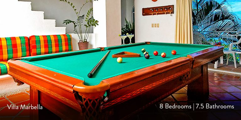 The game room at Villa Marbella features a pool table, 35” TV, VCR, CD player, Wireless internet, and a wet bar.
