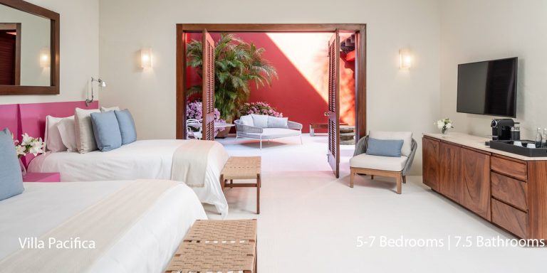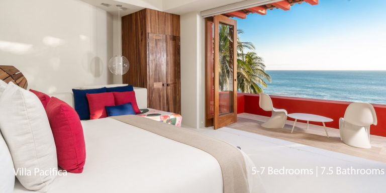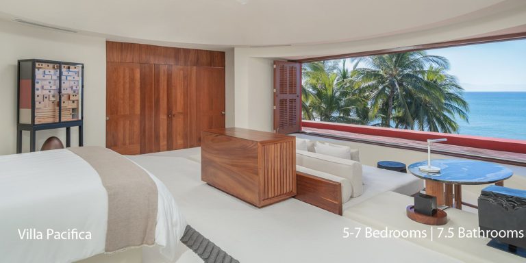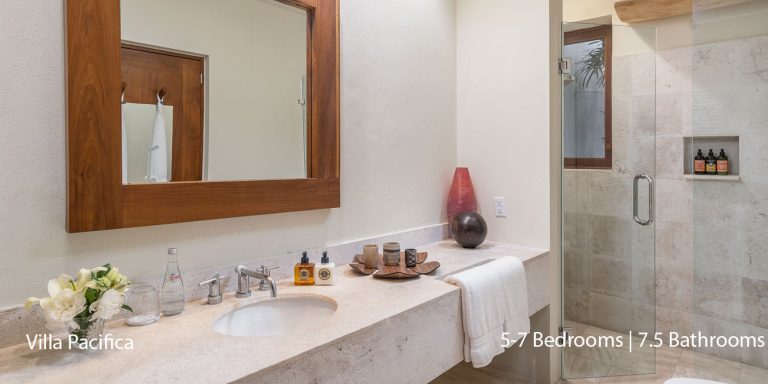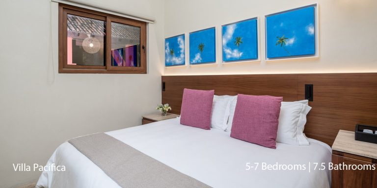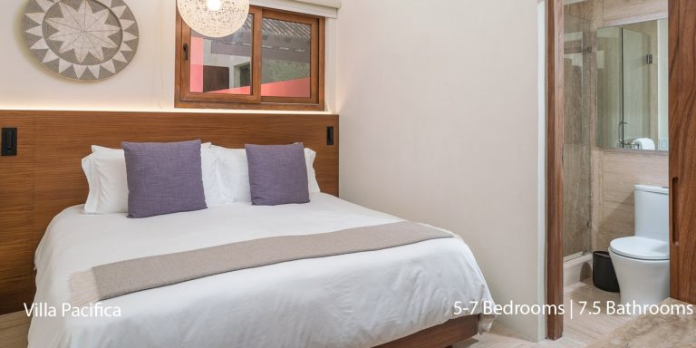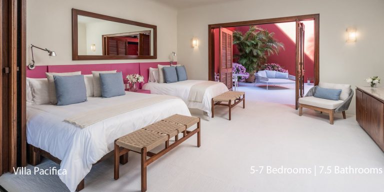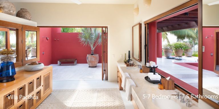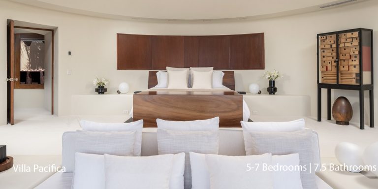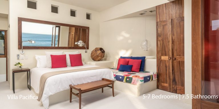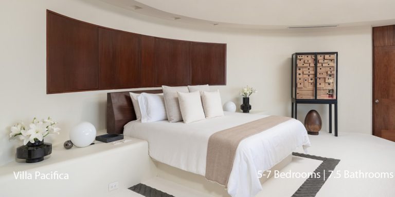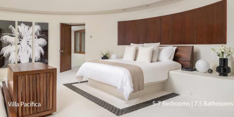 Villa Pacifica features five to seven-bedroom suites.  A sweeping, sophisticated master suite occupies the majority of the top floor. The master suite has a king-sized bed overlooking a recessed seating area with elegant cane furniture. The master suite features huge windows that frame uninterrupted views of the Pacific. There is a spacious master bathroom with indoor & outdoor showers and a private deck with a sunken tub.