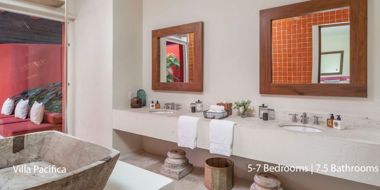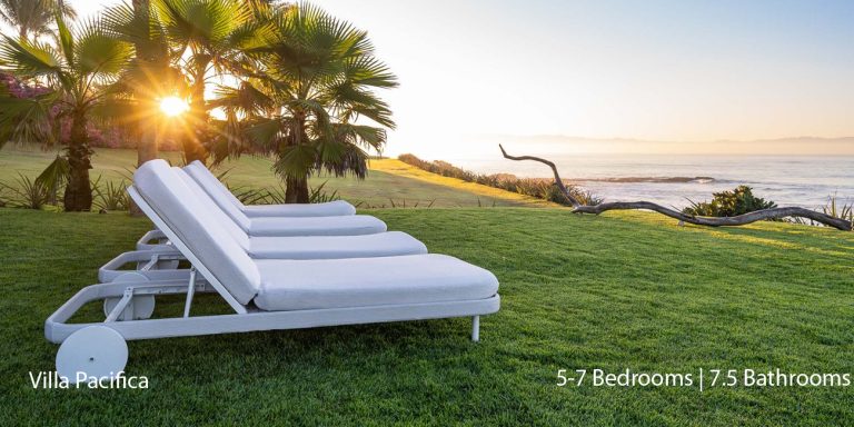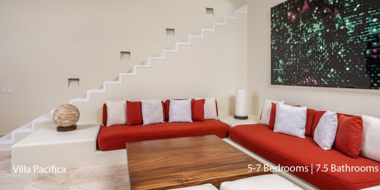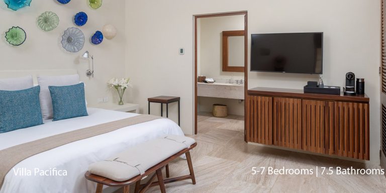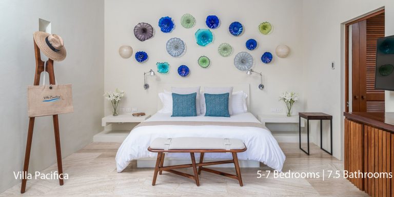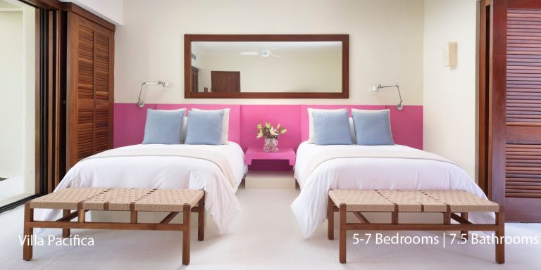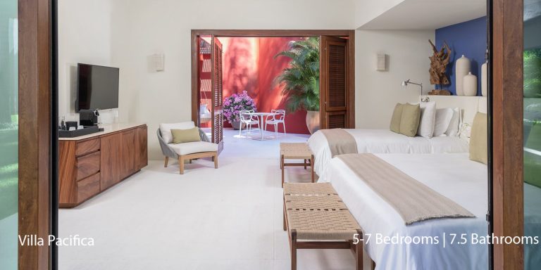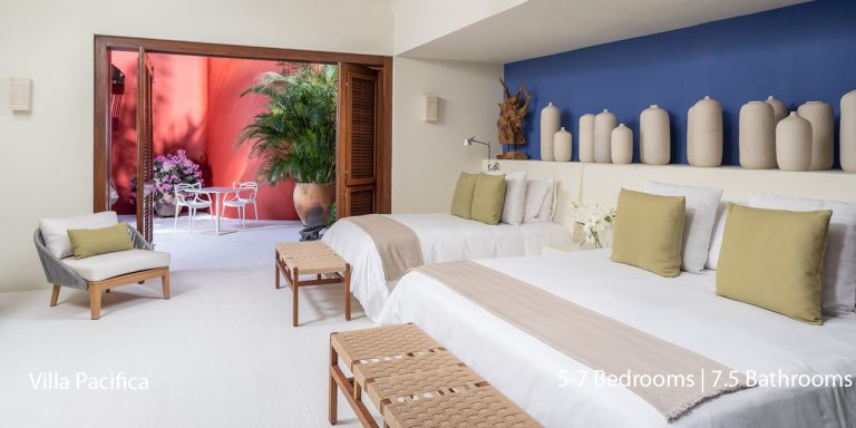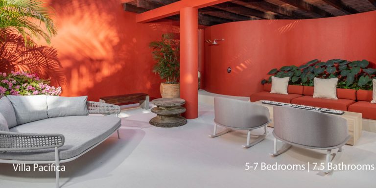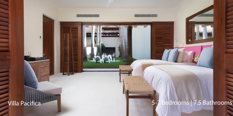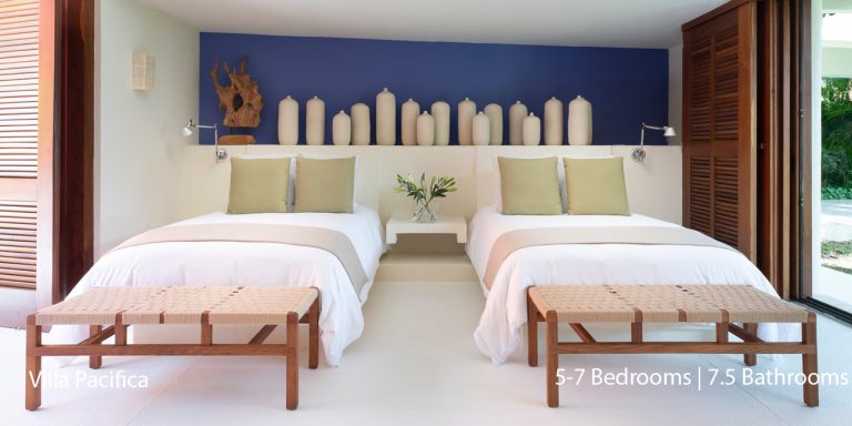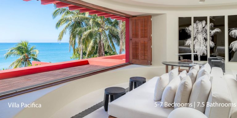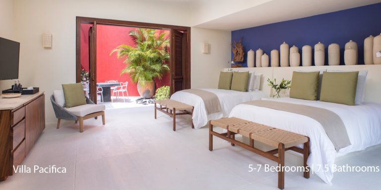 Villa Pacifica features five to seven-bedroom suites.  A sweeping, sophisticated master suite occupies the majority of the top floor. The master suite has a king-sized bed overlooking a recessed seating area with elegant cane furniture. The master suite features huge windows that frame uninterrupted views of the Pacific. There is a spacious master bathroom with indoor & outdoor showers and a private deck with a sunken tub.