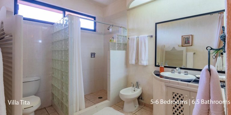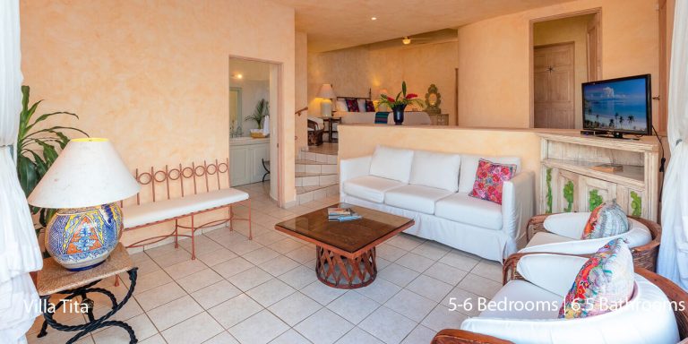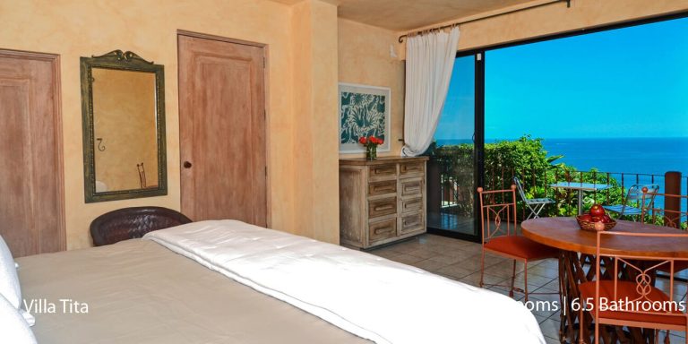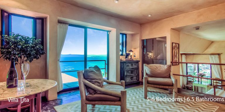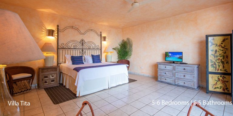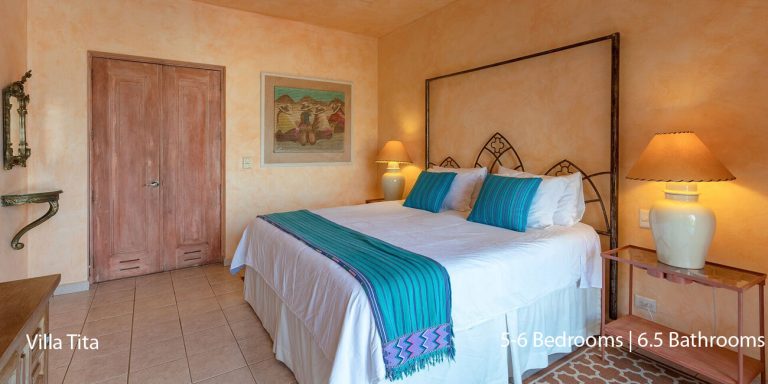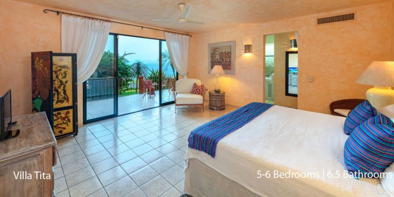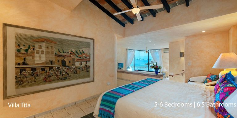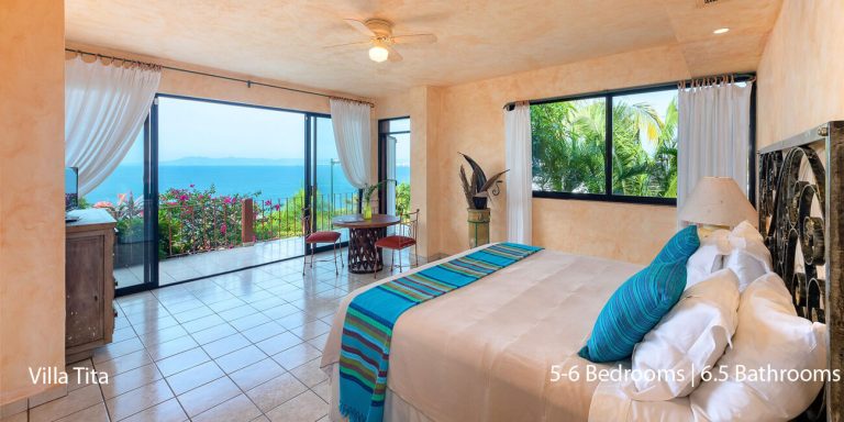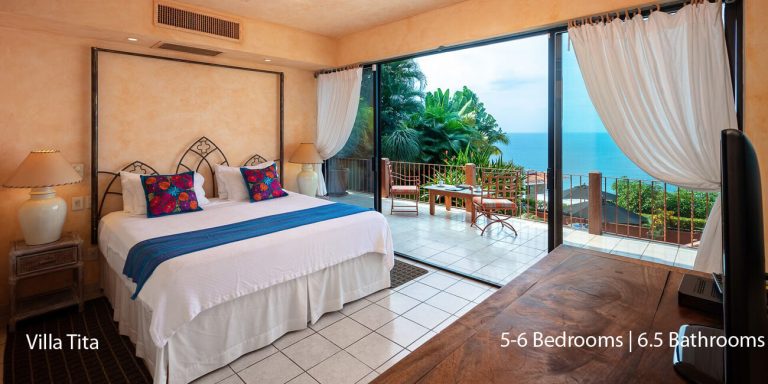 This luxury Mexico villa rental features five king bedroom suites, each with a private en-suite bath in the main villa and a private Casita with a king bedroom and an en-suite in the 6th bedroom. All bedrooms have beautiful views of the Bay of Banderas or the Sierra Madre Mountains in the background.