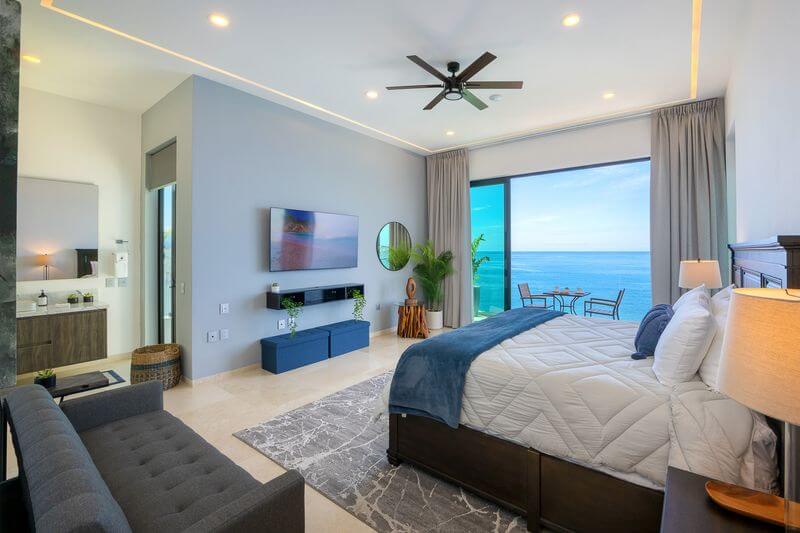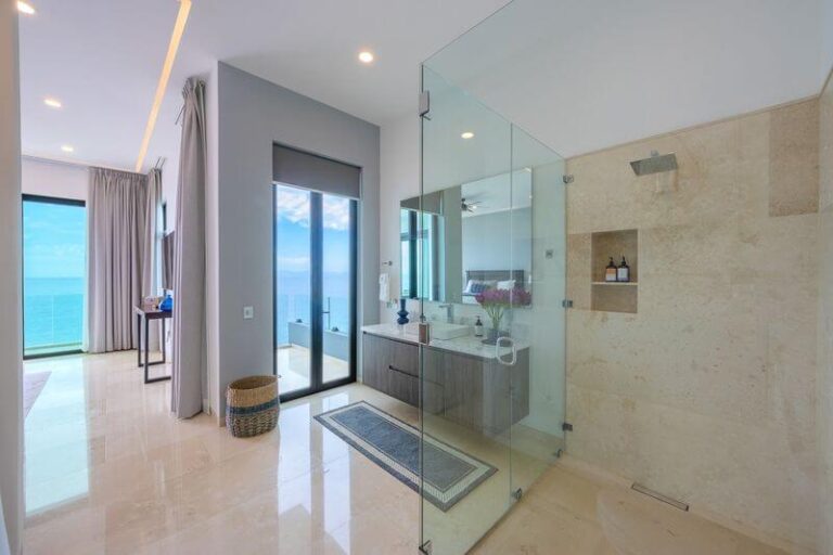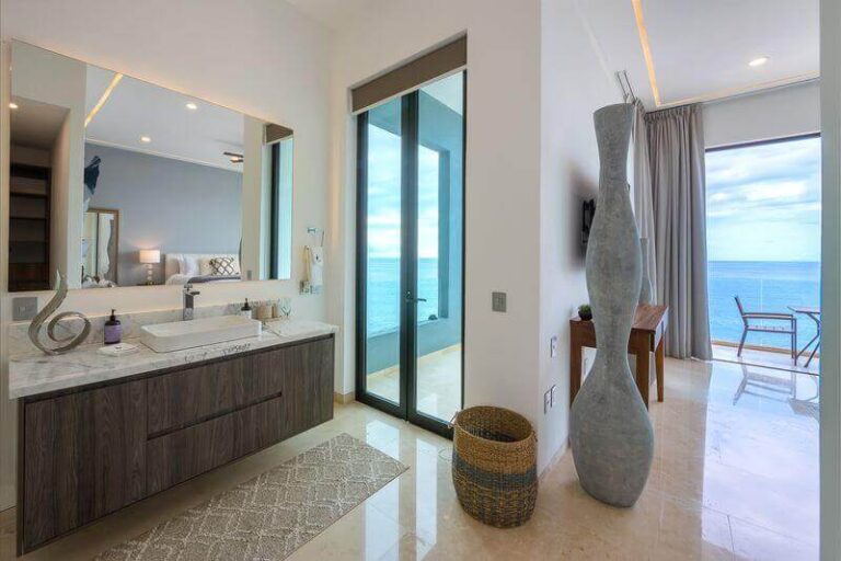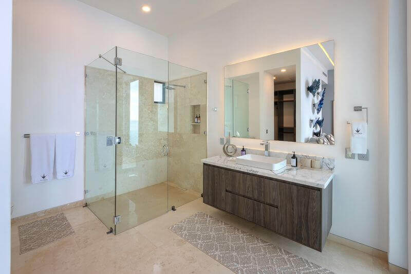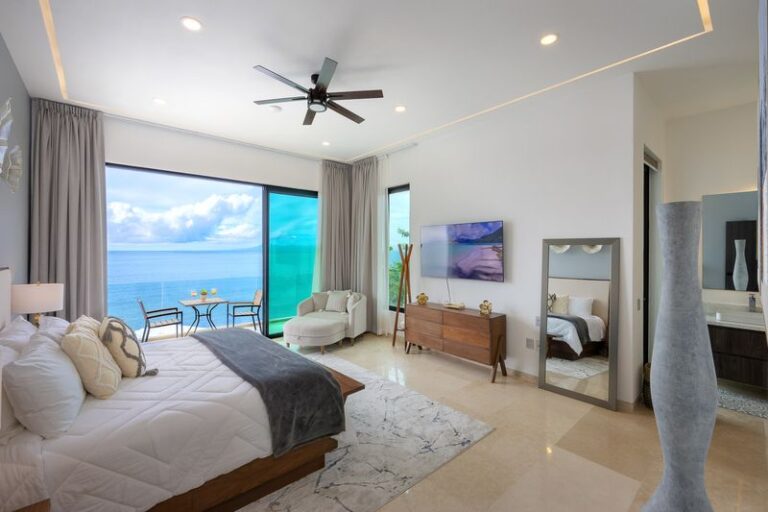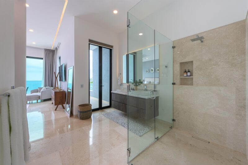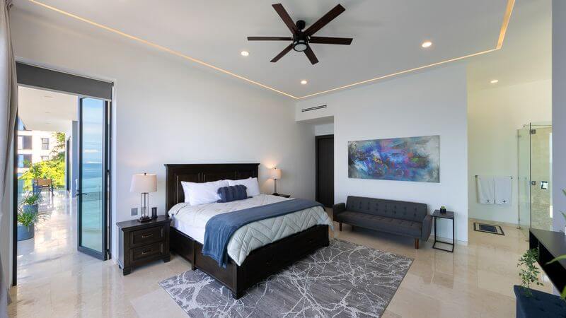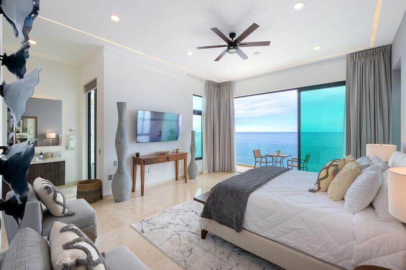 The elevator services all three floors of this magnificent villa, and the second level takes you to two expansive bedrooms – all with ensuite baths and verandas leading to expansive ocean views. Each room is an oasis of luxury, each with a king bed, 600-thread count linens, a beautifully appointed spa-like bath, and a TV.