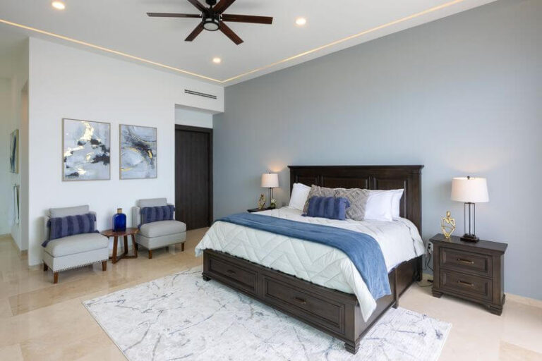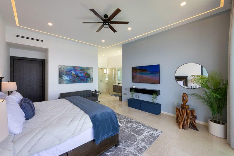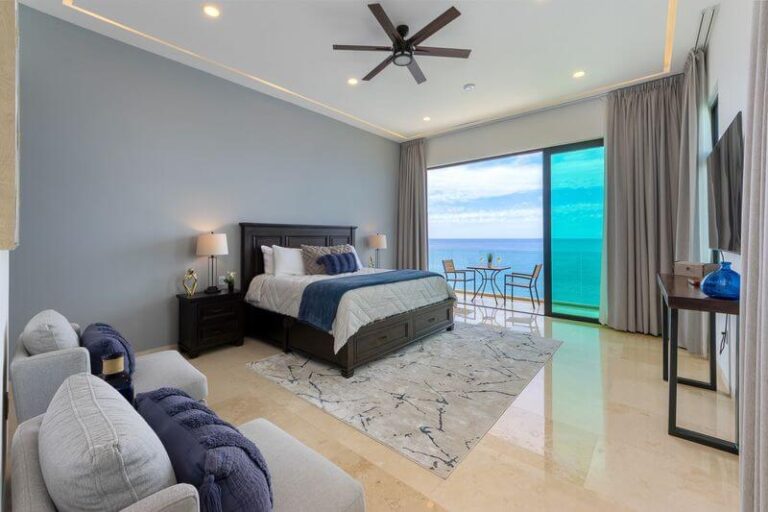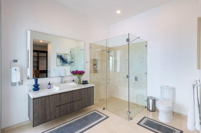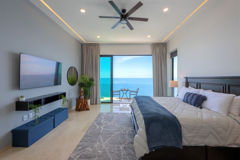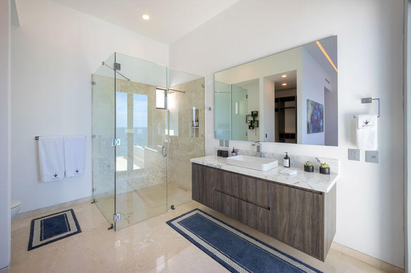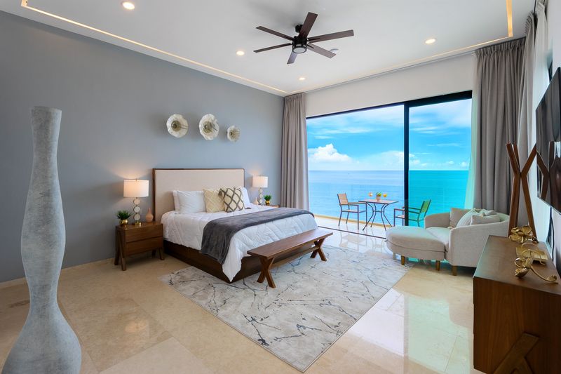 The elevator services all three floors of this magnificent villa, and the second level takes you to two expansive bedrooms – all with ensuite baths and verandas leading to expansive ocean views. Each room is an oasis of luxury, each with a king bed, 600-thread count linens, a beautifully appointed spa-like bath, and a TV.