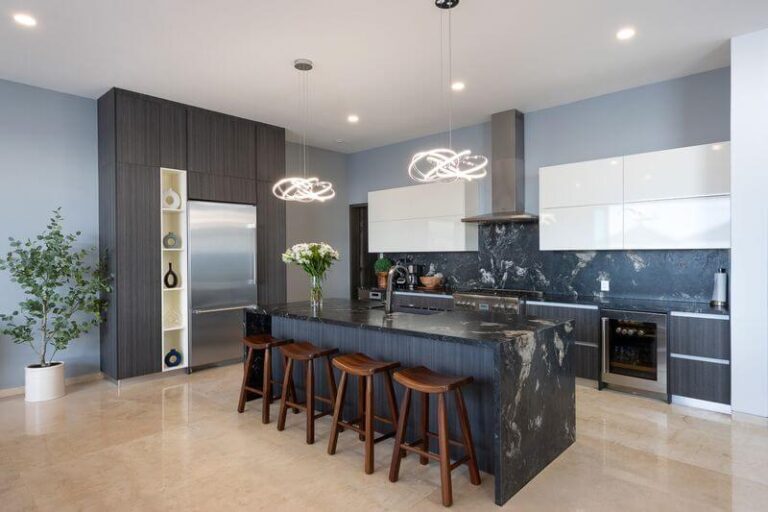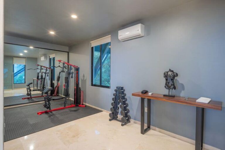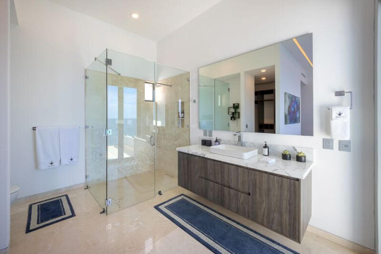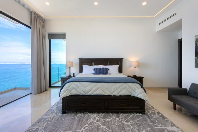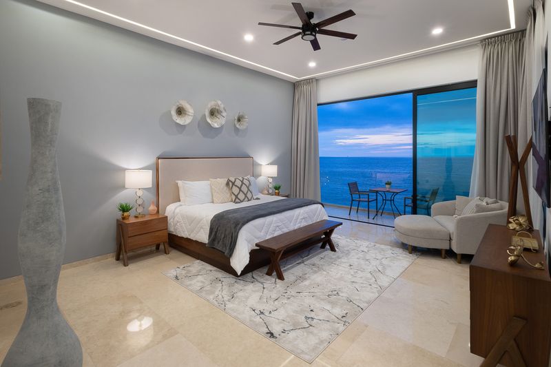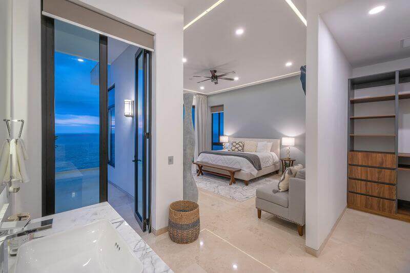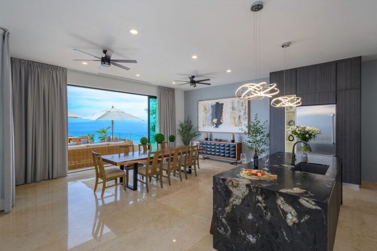 The main floor features a Chef’s kitchen with an expansive marble island, a dining room, and a living area that opens onto the expansive patio and pool area. This floor is home to the Super Master bedroom suite, accenting soft beige and white décor, and a private spa. This room is an oasis of luxury opening directly to the pool deck, with views of the entire bay, downtown, hillside, jungle, and beyond to Punta De Mita and the Marietta Islands in the distance.