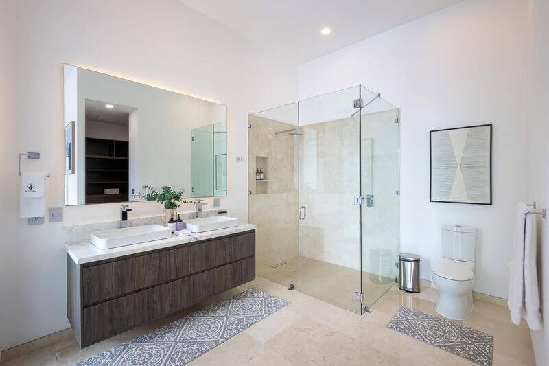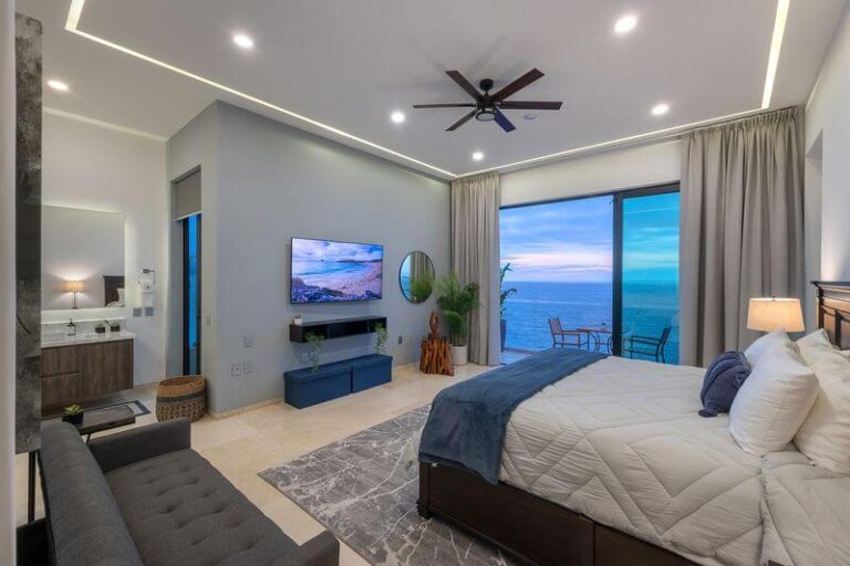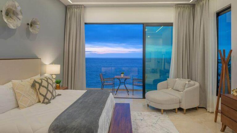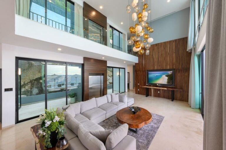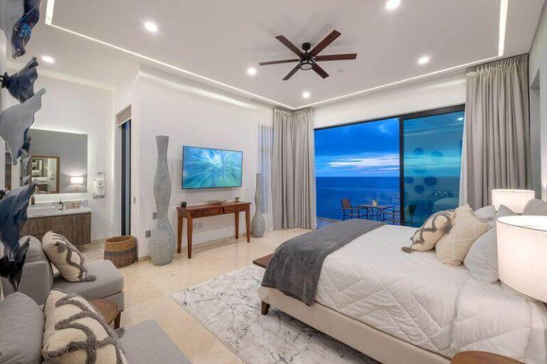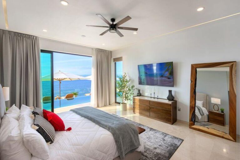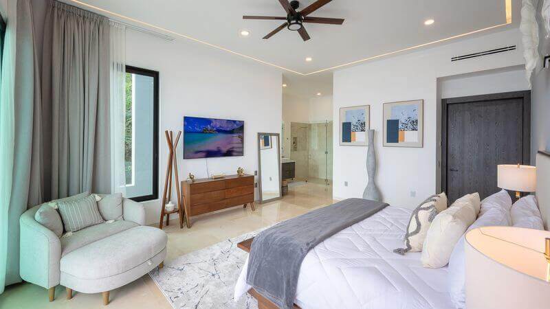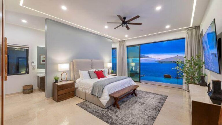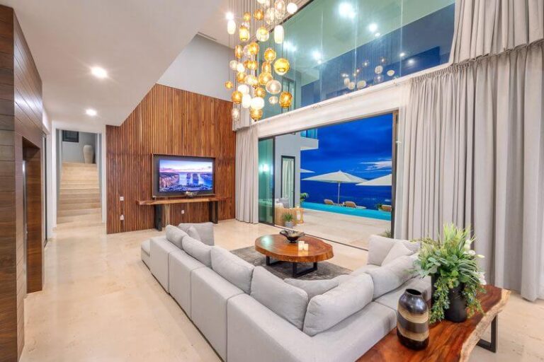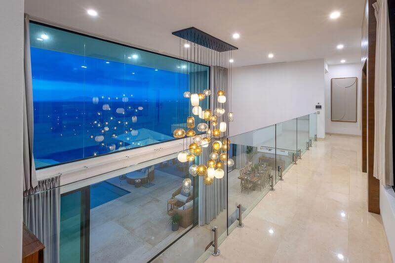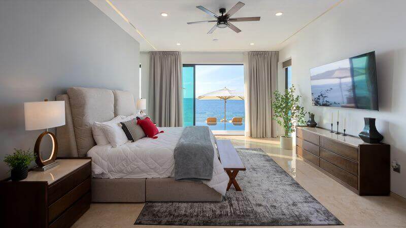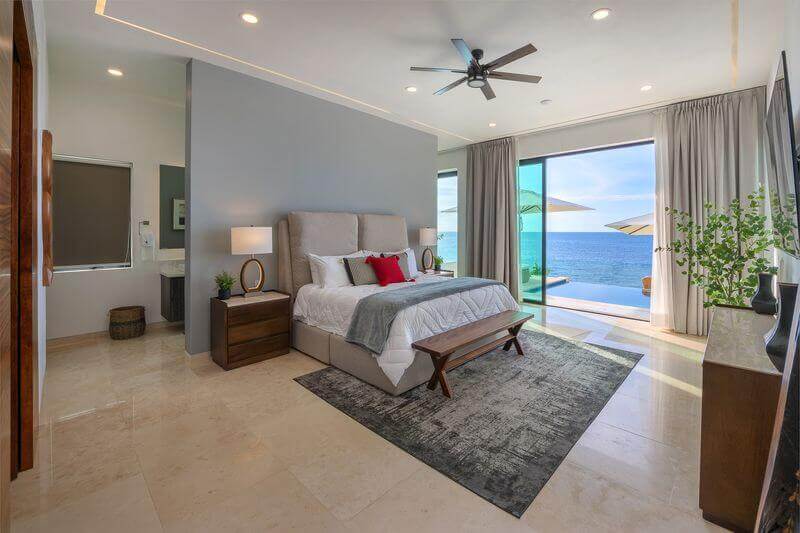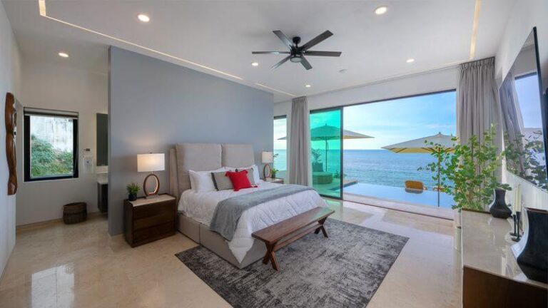 The villa has five master bedrooms, each with an en-suite and views of the bay. A sixth bedroom has a double bed and is ideal for teens. There is a game room, a gourmet Chef’s kitchen, posh living spaces, cozy lounges, and the crown jewel – an oceanfront infinity pool that falls away into the vast views of the Bay.
