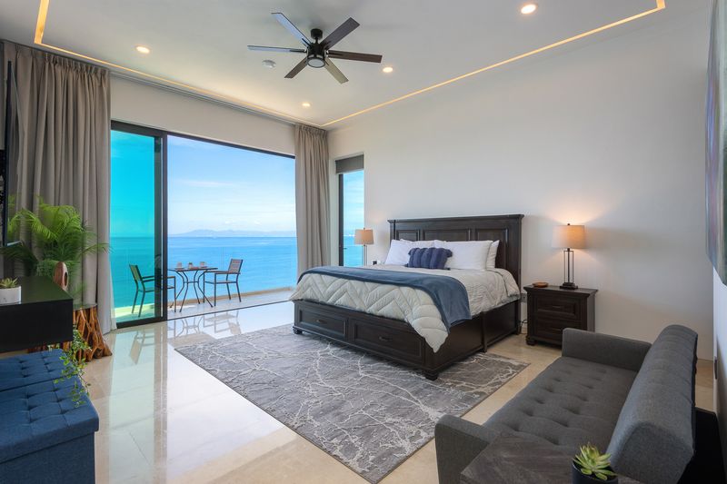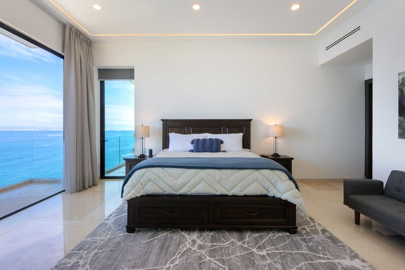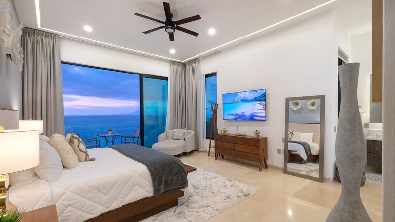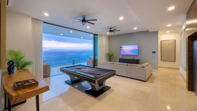 Enter the grand entry hall, expansive windows, views of the entire Bay of Banderas, the Sierra Madre Mountains, and the green jungles of the Vallarta hillsides. This entry is the game room level and features two bedrooms with en-suite baths and private balconies overlooking spectacular ocean views. Each bedroom opens to a wonderful game room, a pool table, a large overstuffed couch, and a TV.